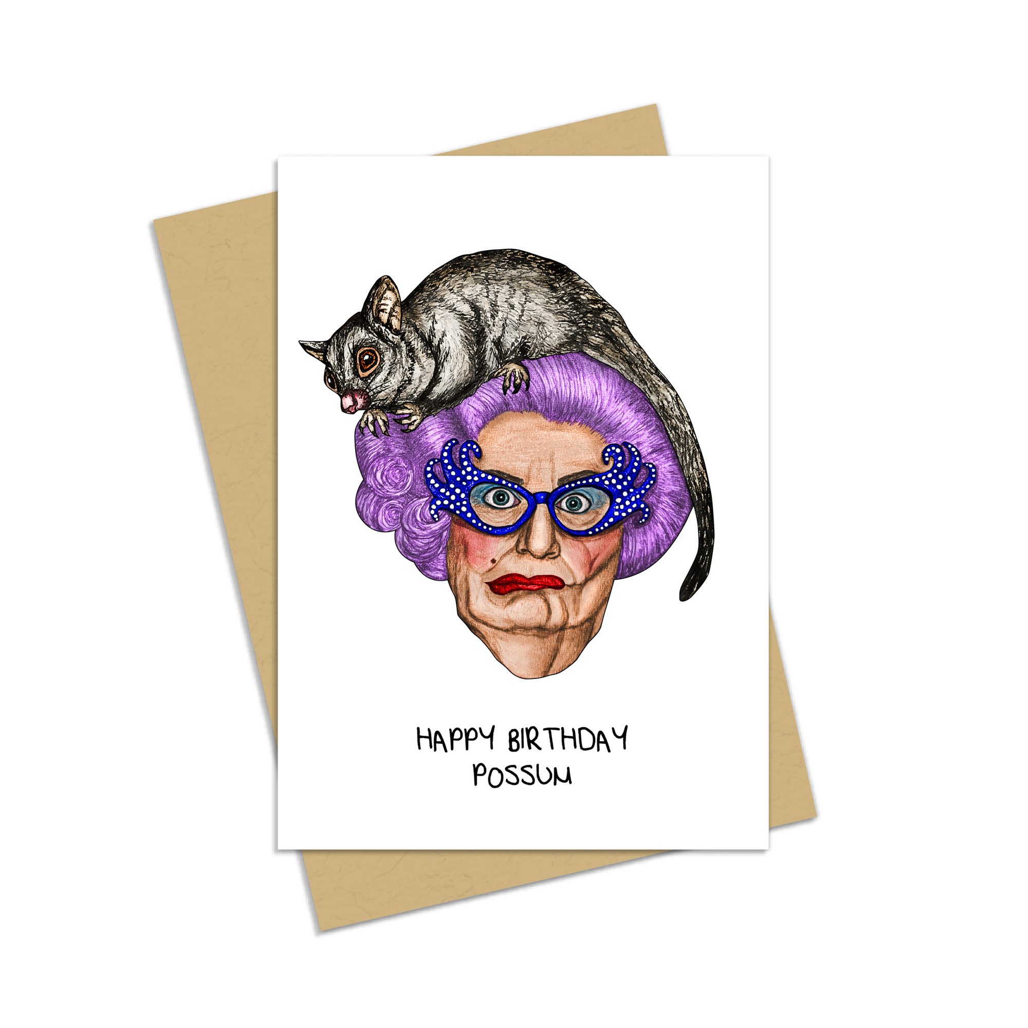 Cheeky Australiana Greeting card featuring Dame Edna and a possum with the words “Happy Birthday Possum”