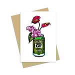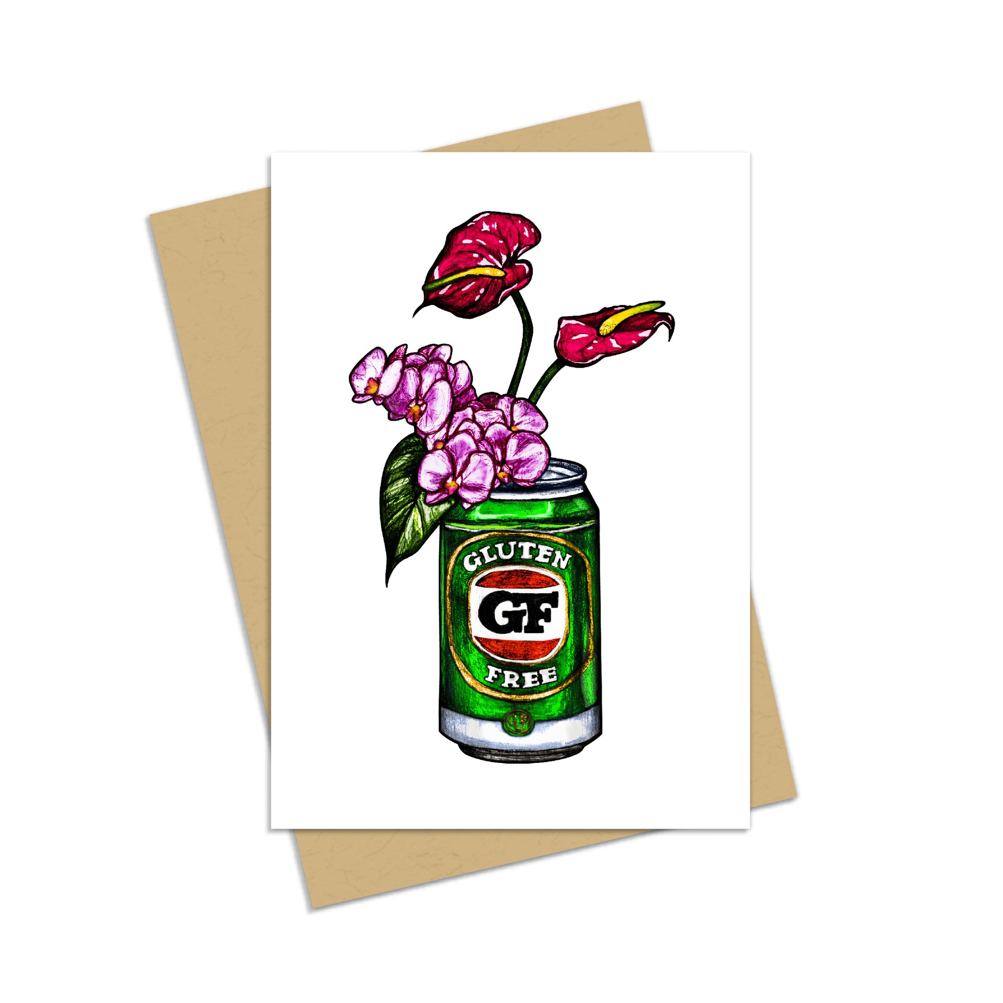 Cheeky Australiana Greeting card featuring a Victoria Bitter can with the words ‘Gluten Free’ used as a pretty little vase with flowers